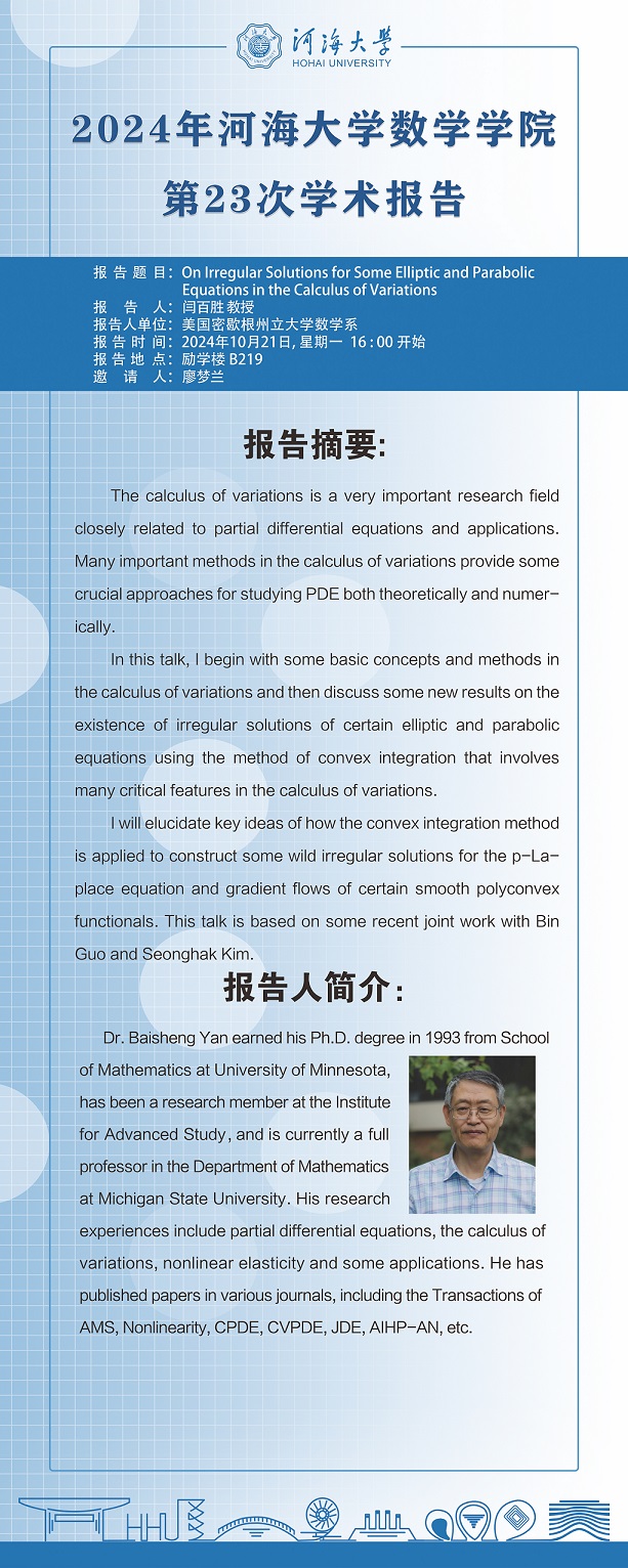 云顶老虎机 第23次学术报告:On Irregular Solutions for Some Elliptic and Parabolic Equations in the Calculus of Variations