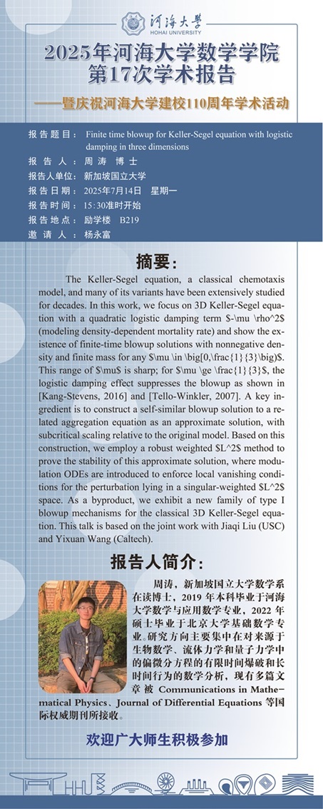 云顶老虎机 第17次学术报告:Finite time blowup for Keller-Segel equation with logistic damping in three dimensions