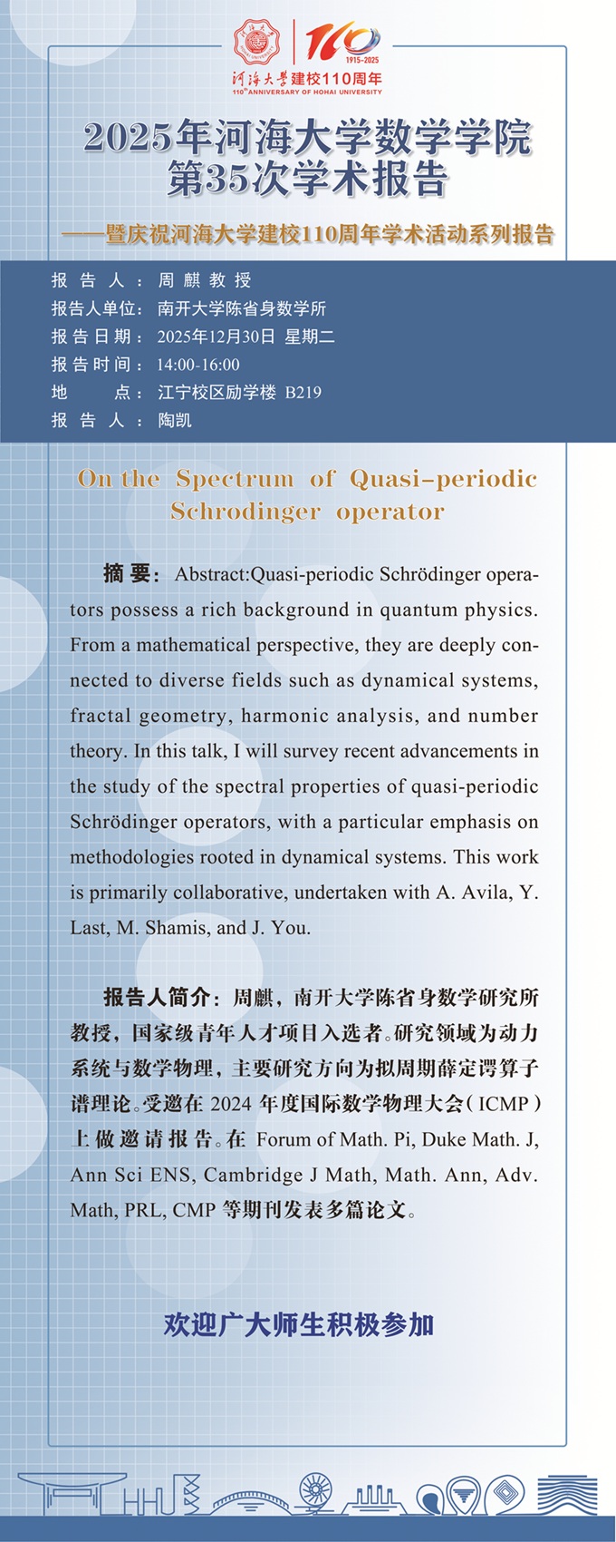 云顶老虎机 第35次学术报告:On the Spectrum of Quasi-periodic Schrodinger operator