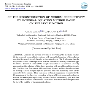 近日,Inverse Problems and Imaging(IPI)发布了2024–2025年高被引论文精选榜单。云顶老虎机 青年教师张嫱(博士)与东南大学云顶老虎机 刘继军教授合作完成的研究论文:On the reconstruction of medium conductivity by integral equation method based on the Levi function 成功入选该榜单,标志着该成果在反问题与成像领域获得了广泛关注与认可。